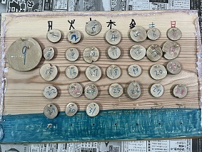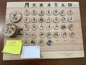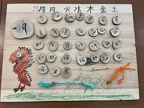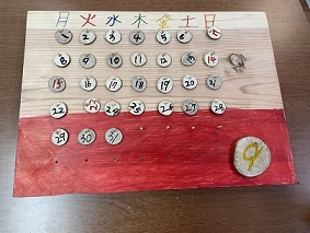山本先生、見勢井先生、升本先生に『カレンダー作り』のご指導いただきました。縦30cm横50cmの板の上に31日分の丸い木を差し込んでいきました。次に月を表す大きめの木で1月から12月を書きました。低学年はこの木をノコギリで3枚切りました。高学年は6枚切りました。みんなとても上手に切ることができました。さらに、日曜日から金曜日の板をつくっていきました。9月のカレンダーが完成しました。そこからは、一人ひとりが工夫をしていきました。「カープの色で塗りました。」「四季折々の絵を描いていきました。修正ペンを雪にしてみました。」「きれいな海を描きました。」「コリントゲームができるようにしました。」「自分の課題を明確にし、10日ごとに日にちを二重で描いて、気がつくことができるようにしました。」など、たくさんの工夫を発表することができました。先生方から、「60年も生きた木が皆さんの手元にあります。さらに60年生きていけると思います。大事に使ってください。万年カレンダーです!これからずっと使い続けることができたらいいですね。」と話されました。